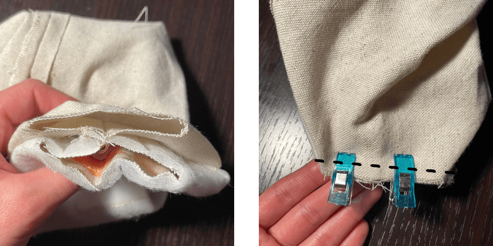 Die Ecken (zusammen mit dem Außen- und Innenteil) umfalten und abnähen, damit sie schön geformt sind. Jetzt ist es an der Zeit, die Tasche auf die richtige Seite zu drehen und zum Schluss die Öffnung zuzunähen, durch die wir die Tasche gewendet haben.