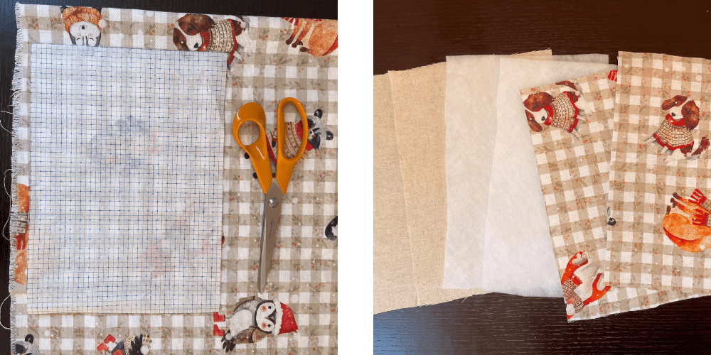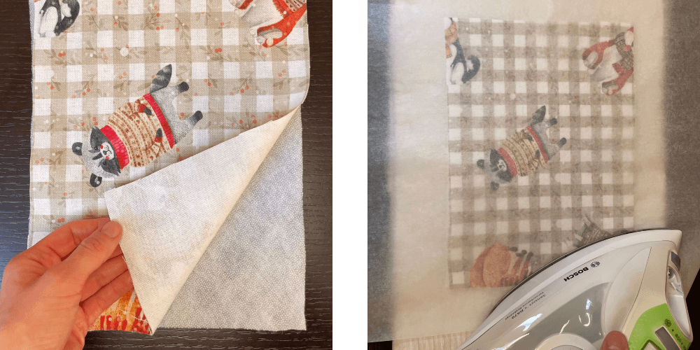 Wir drehen die Einlagen mit der klebenden Seite nach oben und legen die Teile des Außenstoffes mit der rechten Seite nach oben darauf. Wir legen das Backpapier darüber und bügeln, damit die Teile zusammenkleben.