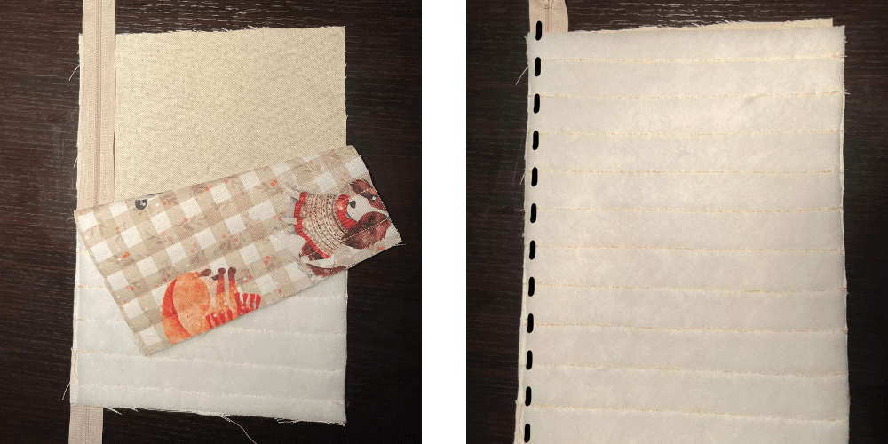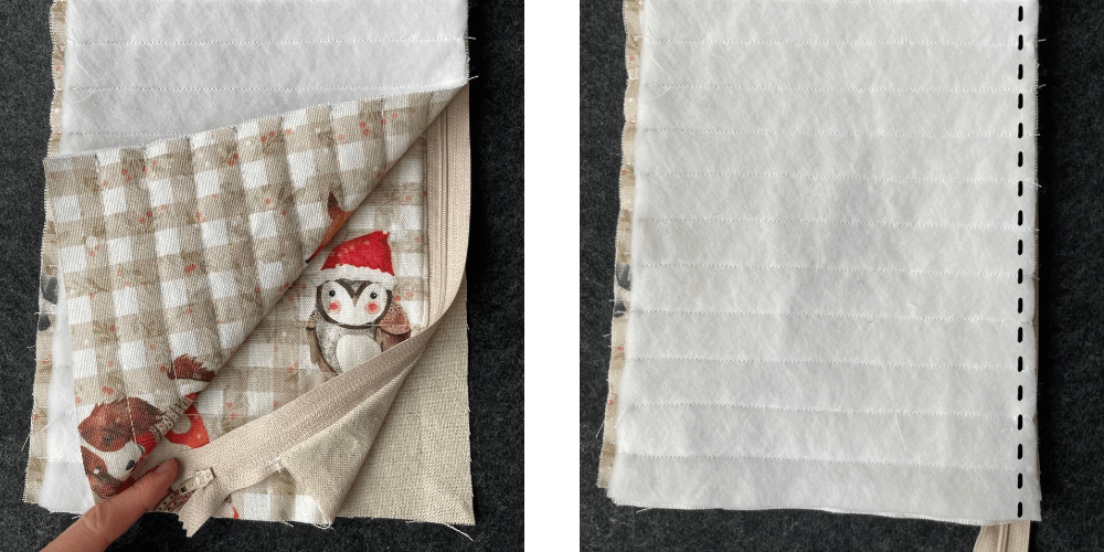 Wiederhole den Vorgang auf der anderen Seite. Nimm zunächst ein Stück Futterstoff, lege den Reißverschluss mit dem „Stoff-Sandwich” darauf, lege den Oberstoff mit der rechten Seite nach unten darauf und nähe alles zusammen.