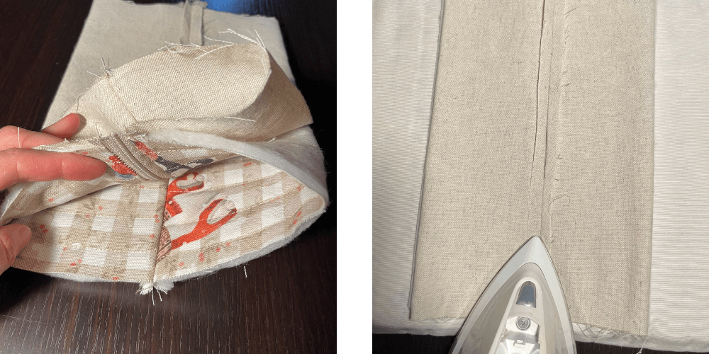 Wir falten die Außenteile und den Futterstoff so zusammen, dass die Nähte parallel zum Reißverschluss verlaufen. Wir bügeln alles gut. Dann falten wir den Außenstoff und den Futterstoff so, dass die Nähte parallel zum Reißverschluss verlaufen. Wir bügeln alles gut, damit die Lagen fest anliegen.