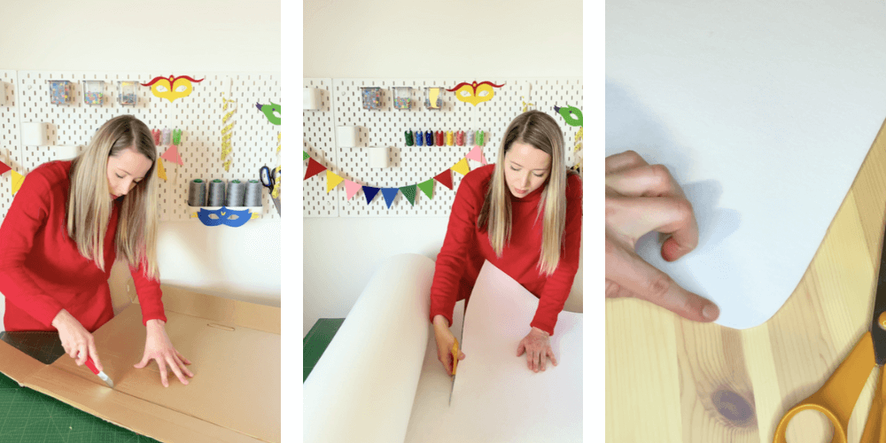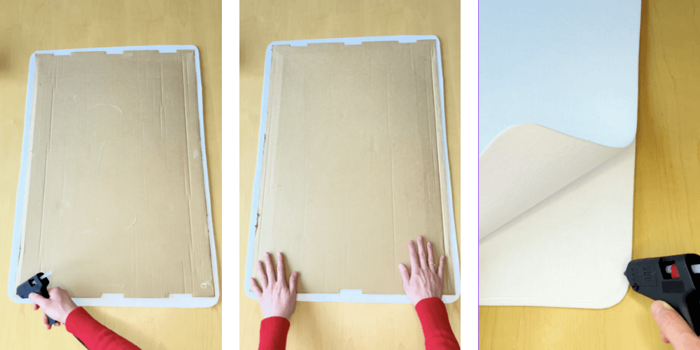 Den Karton kleben wir auf die erste Filzlage, anschließend fügen wir auf der Vorderseite noch eine weitere Filzlage hinzu. Den Vorgang wiederholen wir auch für die Rückseite.