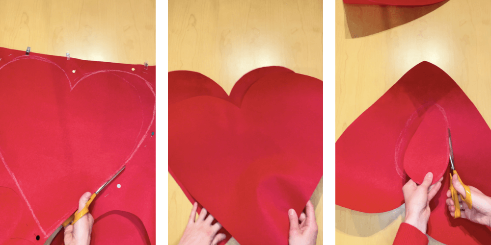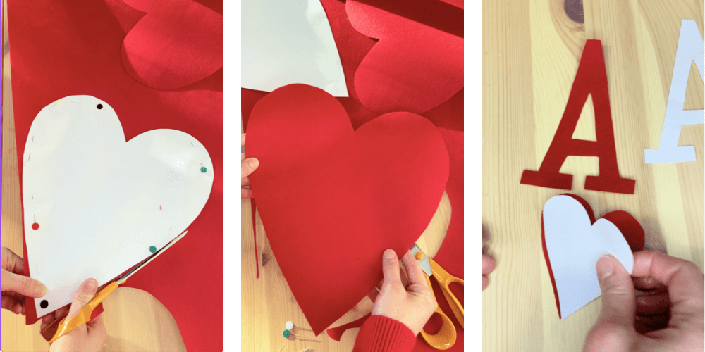Aus zwei Lagen roten Filzes schneiden wir ein großes Herz (oder ein anderes gewünschtes Kartenmotiv) aus. In einen Teil schneiden wir eine Öffnung für das Gesicht.