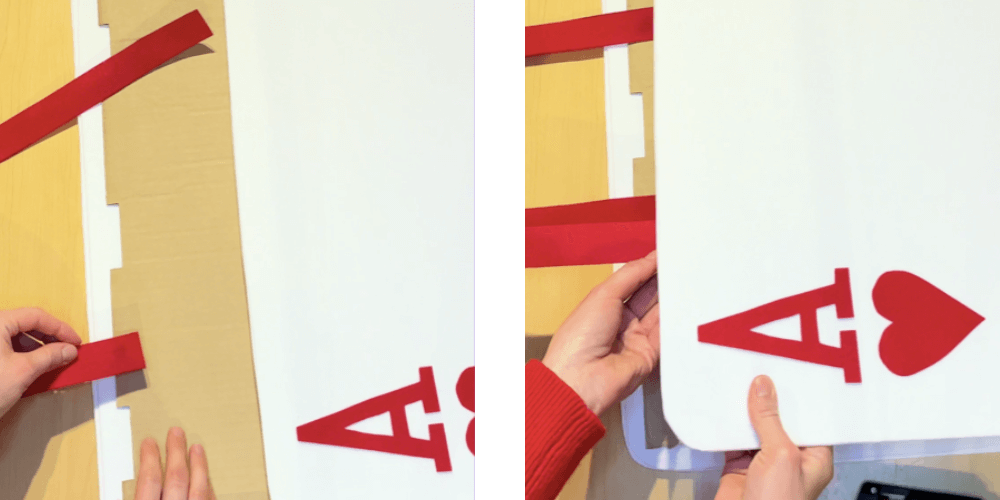Aus dem Karton schneiden wir zwei Teile in Spielkarten-Größe aus – für die Vorder- und Rückseite des Kostüms. Aus dem weißen Filz schneiden wir vier identische Teile in Kartongröße zu und runden die Ecken leicht ab.