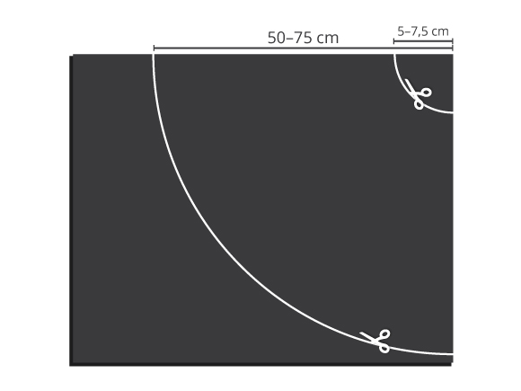 Aus der Ecke messen Sie den Halbmesser 50 cm (75 cm für den Erwachsenen) heraus und zeichnen Sie eine halbkreisförmige Linie mit der Schneidekreide. Zeichnen Sie auch ein Halsloch. Der Halbmesser des Kragens sollte 5 cm (7,5 cm für den Erwachsenen) groß sein. Schneiden Sie aus!