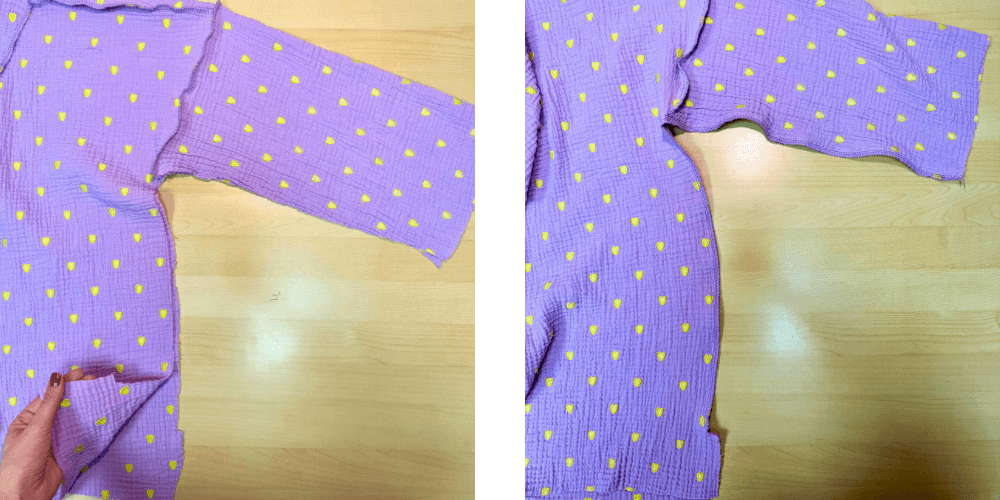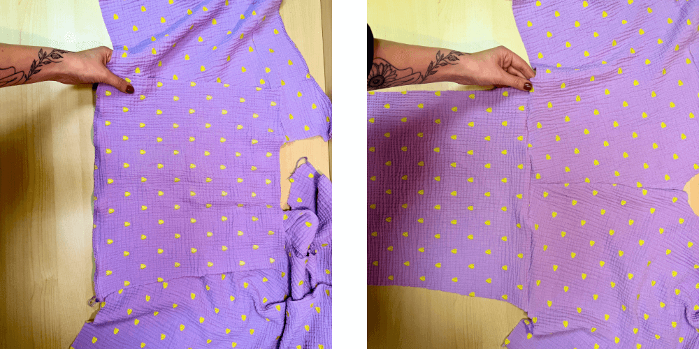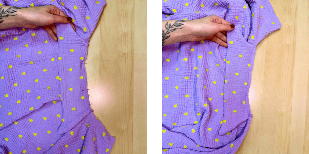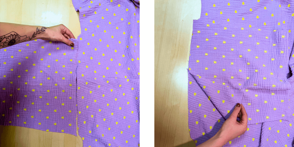 Legen Sie das Hemd so zusammen, dass die Vorderteile auf dem Rückteil liegen, und nähen Sie anschließend die Seitennaht und die Ärmelnaht.