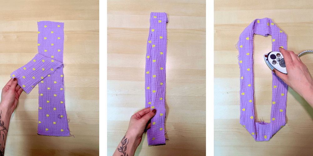 Nähen Sie den Bund: Legen Sie zwei Teile rechts auf rechts und nähen Sie die beiden kurzen Seiten zusammen.